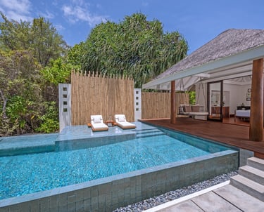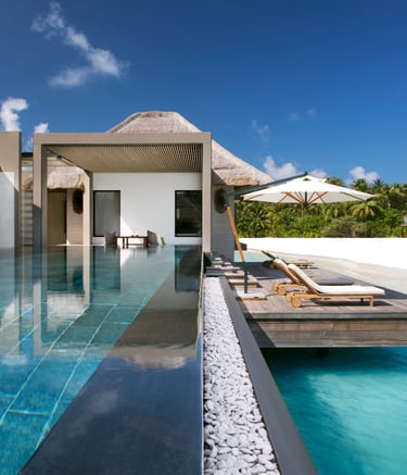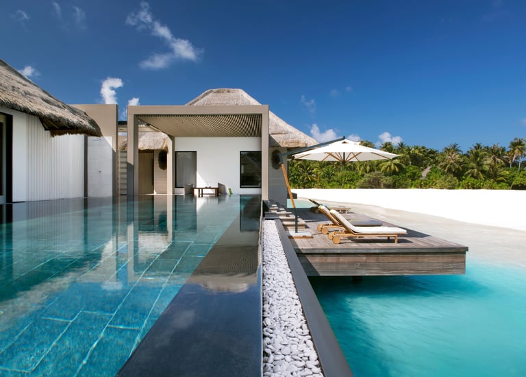 • Private infinity-edge pool: Overlooking the turquoise lagoon, perfect for sunrise dips or sunset reflections