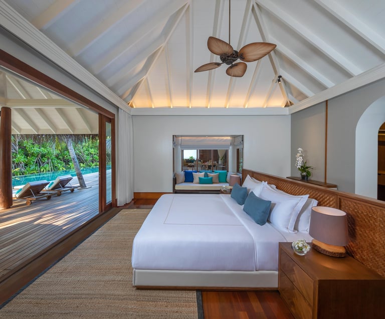 • Décor: Contemporary Maldivian design with groove-lined timber, high ceilings, and calming textures