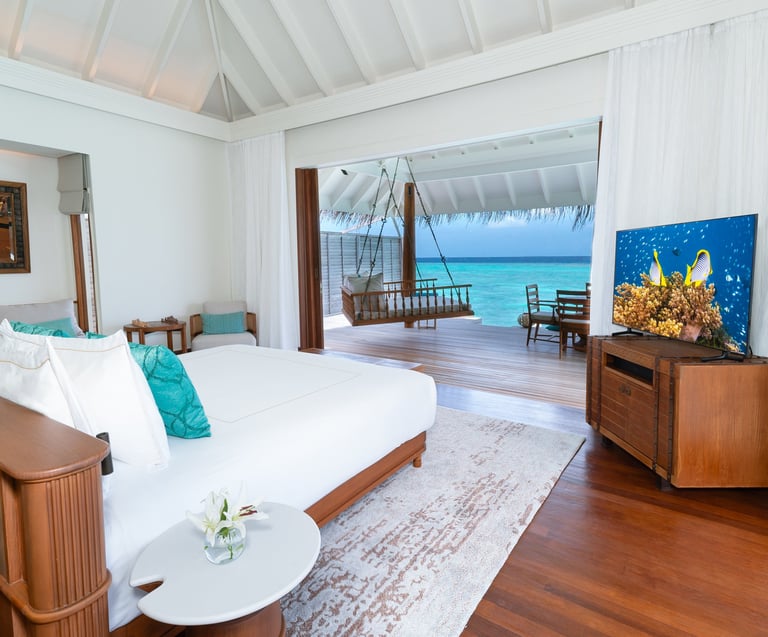 • Décor: Calming interiors with natural textures and contemporary Maldivian artistry
