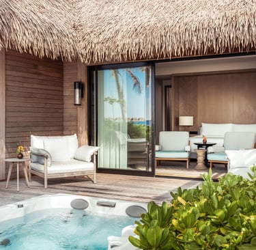Each villa features enhanced outdoor spaces, furnished with elegant yet comfortable lounges facing stunning ocean views.