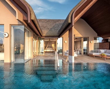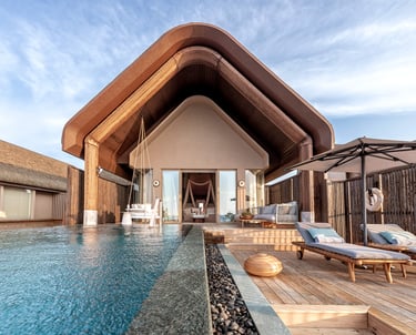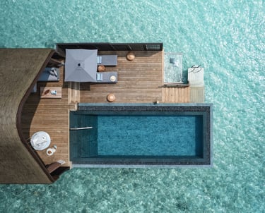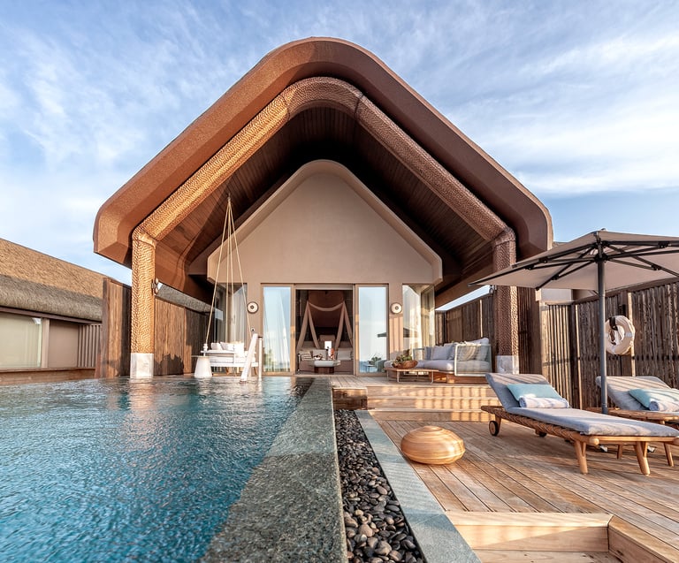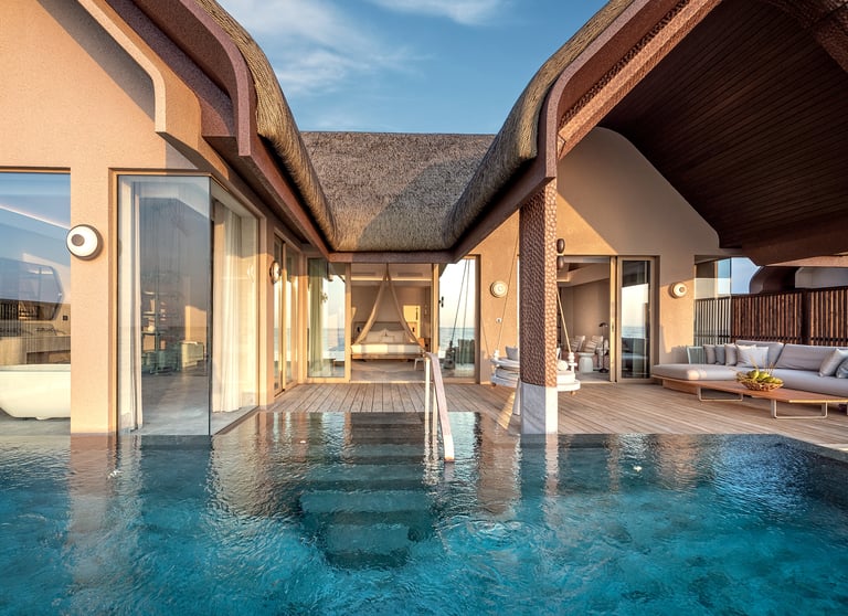 • Design: Suspended above the lagoon with panoramic glazing, biophilic architecture, and curated wellbeing zones