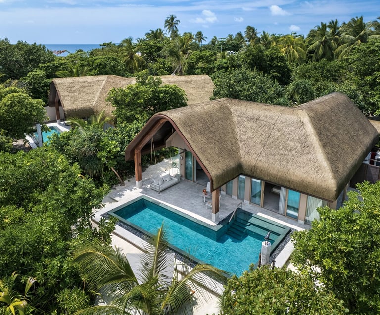 • Located on Bodufushi Island in Raa Atoll, surrounded by untouched forest, crystalline lagoons, and biophilic architecture