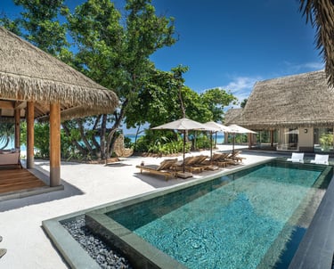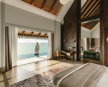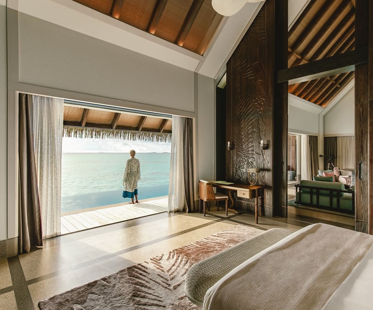 • Design: Suspended at the end of the water villa jetty for ultimate privacy, with curated art, private balconies, and panoramic glazing