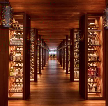 Designed by renowned Tokyo architect Noriyoshi Muramatsu, Saoke is a culinary sanctuary suspended over the sea, where Japanese tradition meets contemporary refinement. Illuminated sake bottles flank the entrance, guiding guests into a world of geometric woodwork, ambient lighting, and ocean whispers.