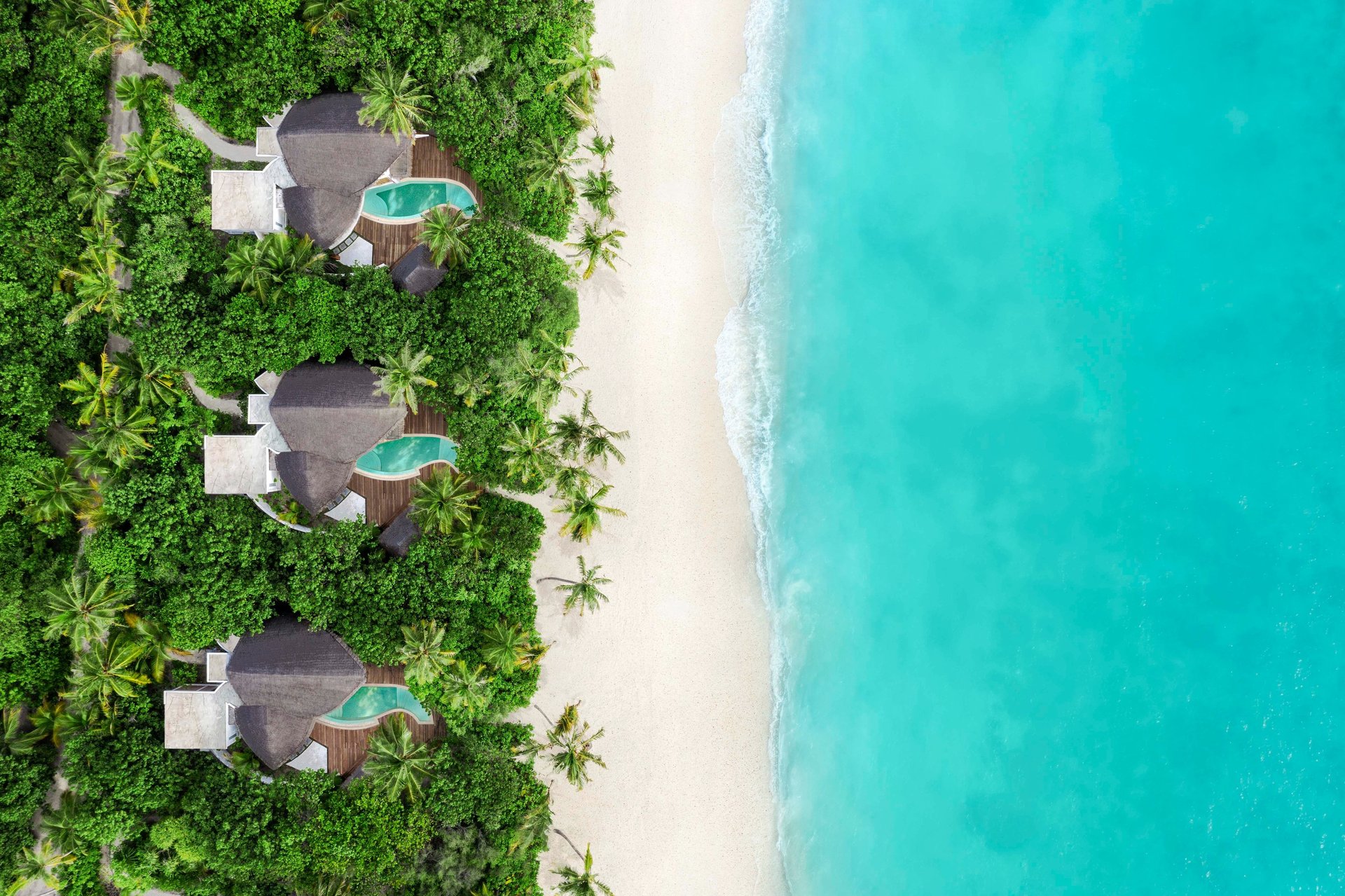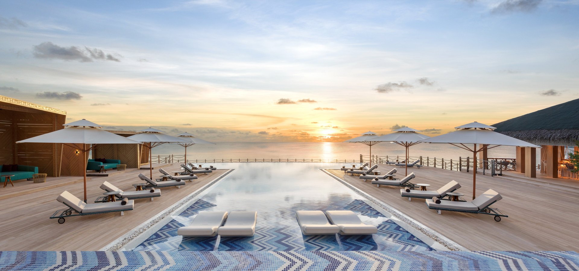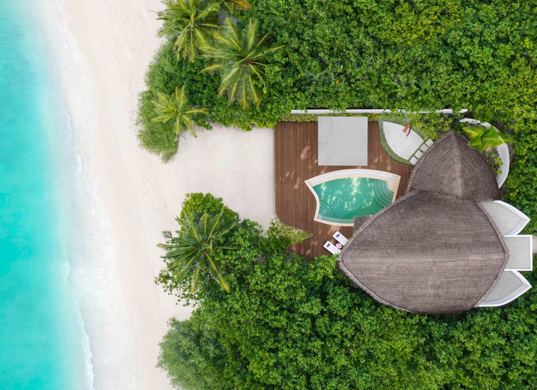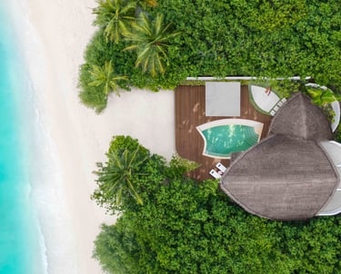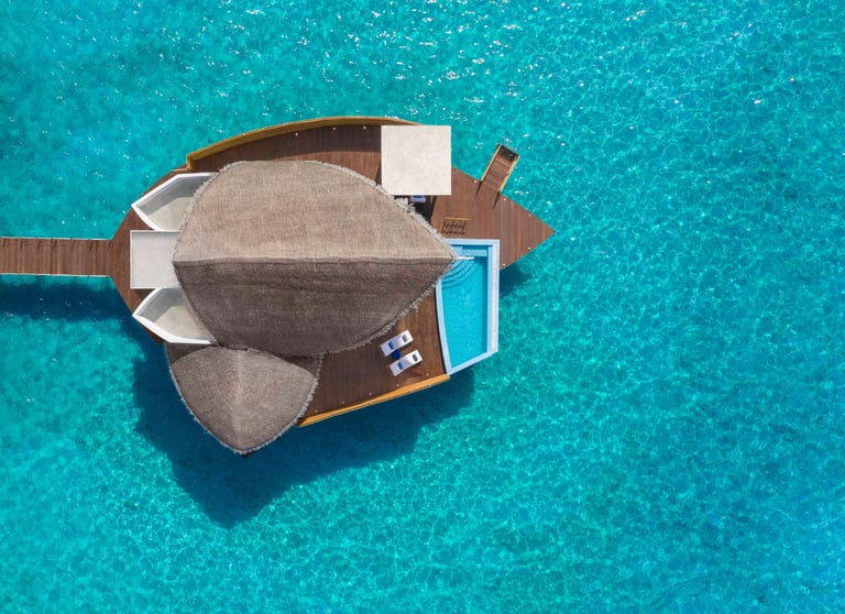 Villas designed with layered luxury—Duplex Overwater Pool Villas and Beach Pool Villas feature private decks, infinity pools, and panoramic Indian Ocean vistas.