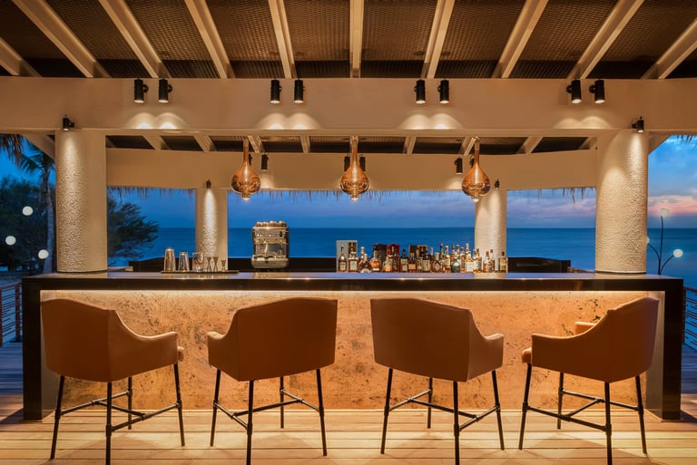 • Décor: Contemporary and airy, with coral-inspired lighting and beachy hues