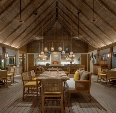 By day, Drift serves light, locally inspired lunches under the shade of swaying trees. Think fresh reef fish, marinated with herbs from the resort’s organic garden, and regional curries that celebrate the spice routes of the Indian Ocean. The menu is seasonal, sustainable, and deeply rooted in Maldivian and South Asian culinary traditions.