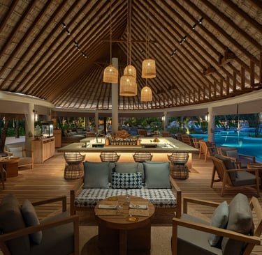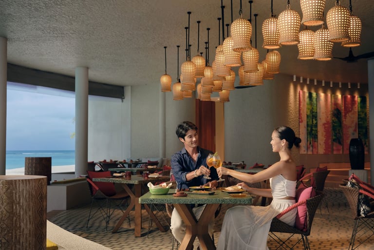 By day, it’s a breezy haven offering light bites and comforting lunches, perfect for lounging with a chilled juice or a crisp rosé while the ocean shimmers below. As golden hour approaches, the energy shifts. The bar comes alive with signature cocktails, curated wines, and the laidback beats of the resident DJ, setting the tone for the Maldives’ ultimate sundowner experience.
