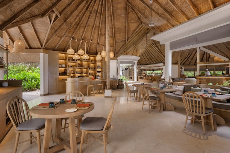 At the heart of Kanuhura’s culinary journey lies The Market, a breezy beachfront restaurant that celebrates the rhythm of the day—from sunrise nourishment to sunset indulgence.