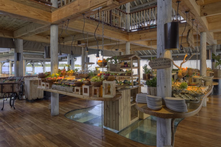 Longitude is the heart of daily dining at Six Senses Laamu—a two-story open-air restaurant suspended above the lagoon, offering panoramic views and a relaxed, breezy atmosphere. Mornings begin with a bountiful breakfast buffet and à la carte options, featuring fresh tropical fruits, house-made pastries, and a live cooking station that changes daily.