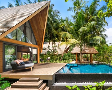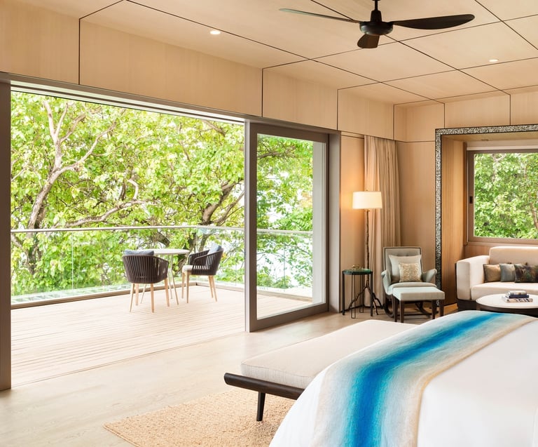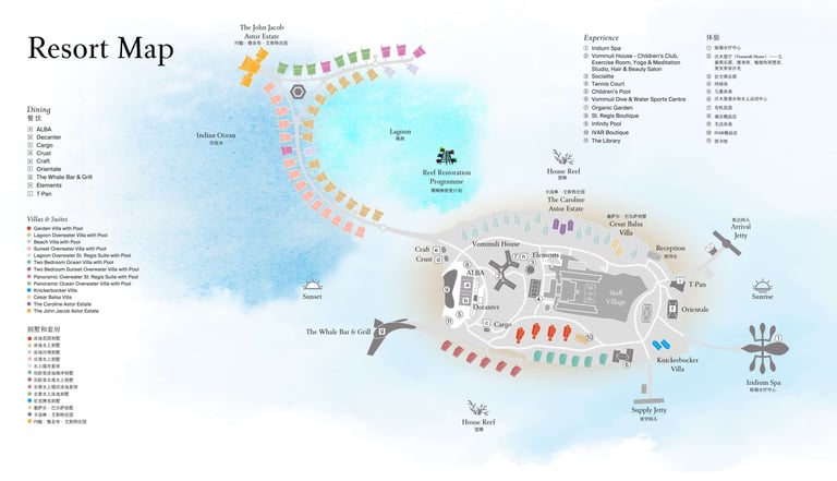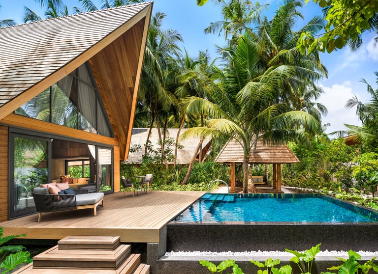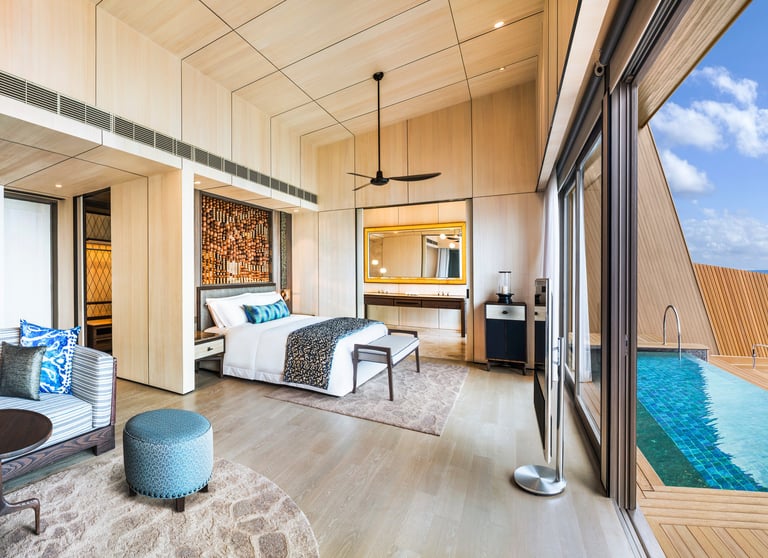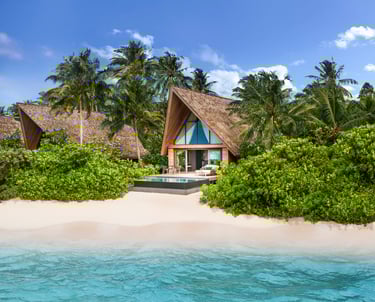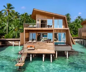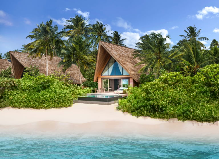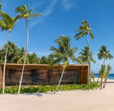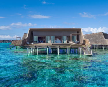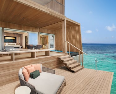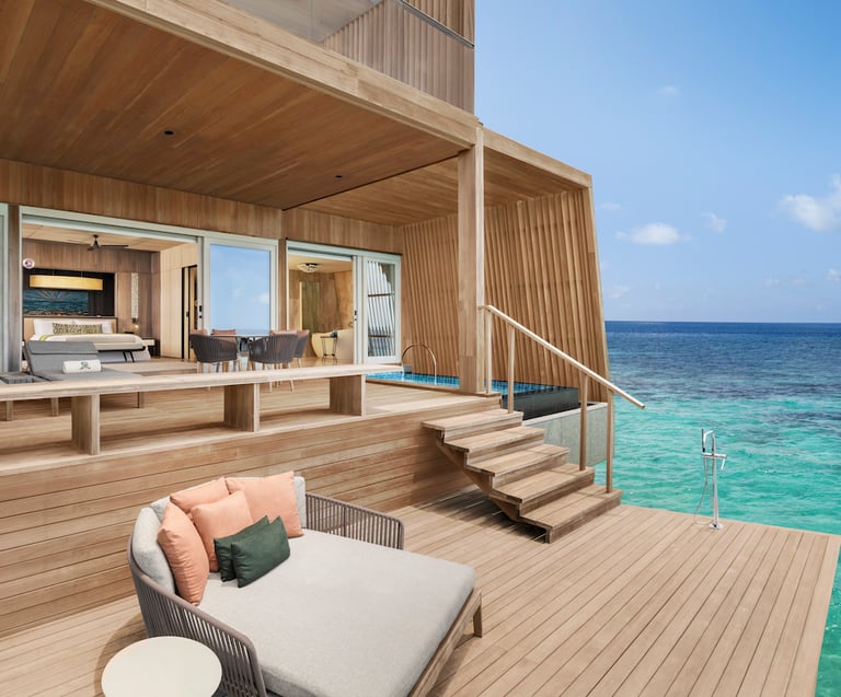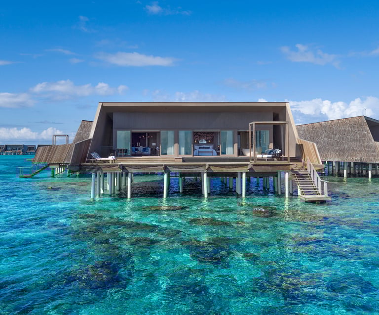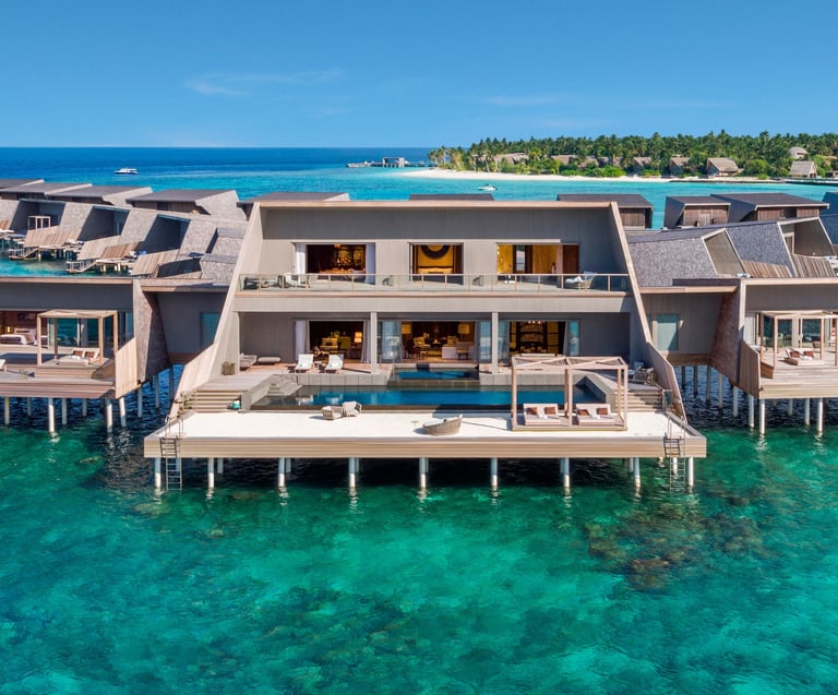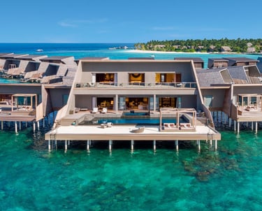 The resort features 77 refined villas, including overwater, beachfront, and garden sanctuaries, each with private pools, panoramic views, and interiors inspired by Maldivian heritage and contemporary design. At the heart of the resort lies the John Jacob Astor Estate, a palatial overwater residence offering 1,400+ sqm of indulgence, complete with a spa room, gym, and infinity pool.
