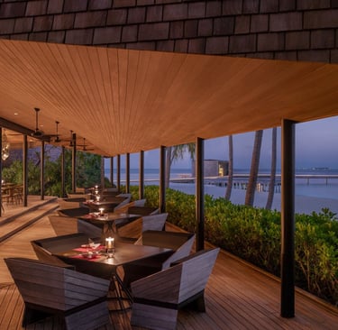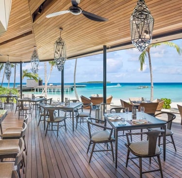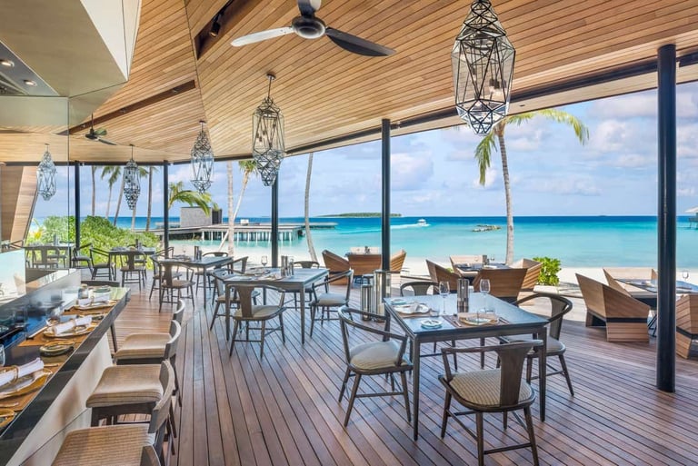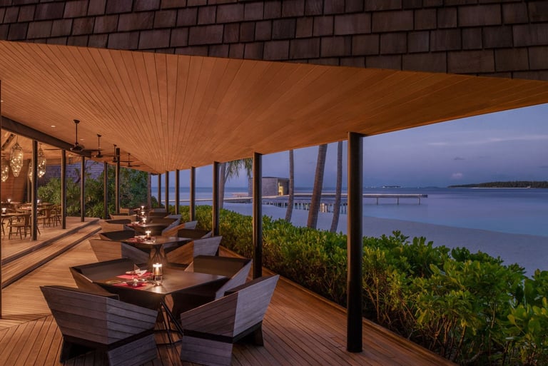Guests arrive to the gentle rhythm of waves and the golden glow of dusk, greeted by the resort’s signature Bloody Mary with a Maldivian twist. The menu features delectable tapas, fresh seafood, and curated small plates designed for sharing and savoring. As the sun dips below the horizon, the open-air deck becomes a front-row seat to nature’s nightly spectacle—accompanied by fine wines, rare spirits, and bespoke cocktails.