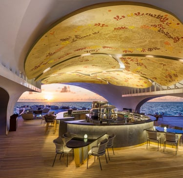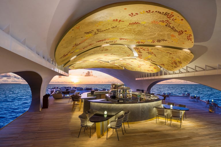 Suspended gracefully above the turquoise waters of the Indian Ocean, The Whale Bar is a masterpiece of architecture and ambiance—its silhouette inspired by the majestic form of a whale shark gliding through the sea. This exclusive overwater venue is more than a restaurant; it’s a sensory experience where sunset rituals, artisanal mixology, and gourmet tapas converge.
