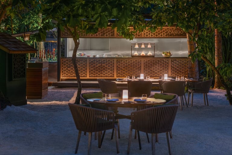 Tucked deep within the resort’s lush tropical gardens, Cargo offers a rare and intimate escape from the beachside bustle. This pop-up-style restaurant transforms each evening into a vibrant celebration of Middle Eastern flavors, served under a canopy of stars and swaying palms.