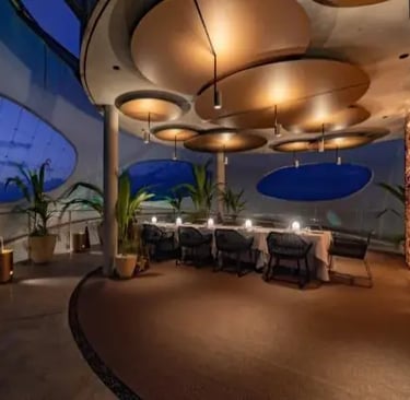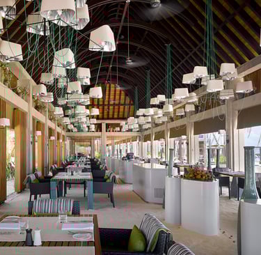 Located directly on the beach with panoramic ocean views. Casual yet elegant ambiance, ideal for relaxed dining from sunrise to sunset. Perfect for barefoot breakfasts, leisurely lunches, and sunset dinners.