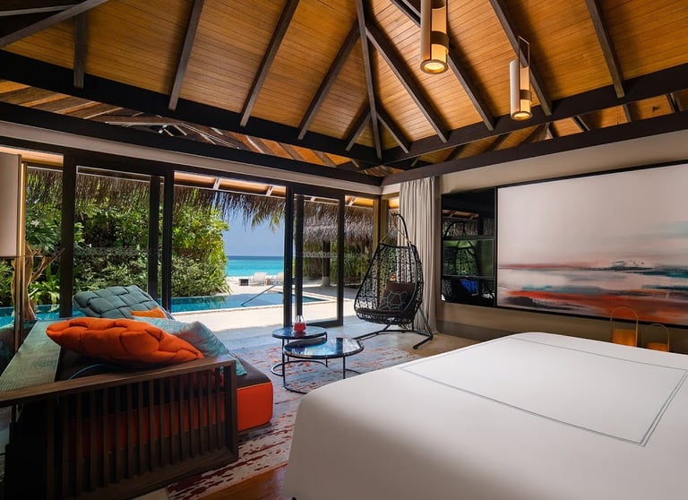 Crafted by Czech architect Petr Kolar, Velaa blends contemporary European sophistication with Maldivian soul. From the ivory-white Tavaru Tower housing one of the region’s most extensive wine cellars, to the overwater Romantic Pool Residence accessible only by boat, every detail whispers of curated indulgence.